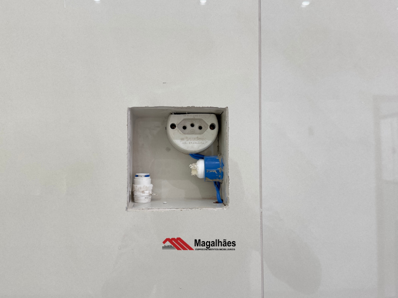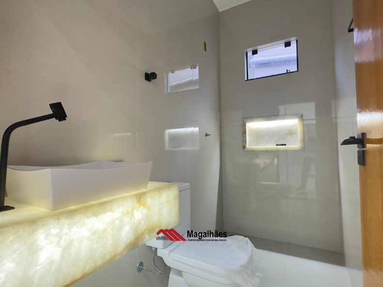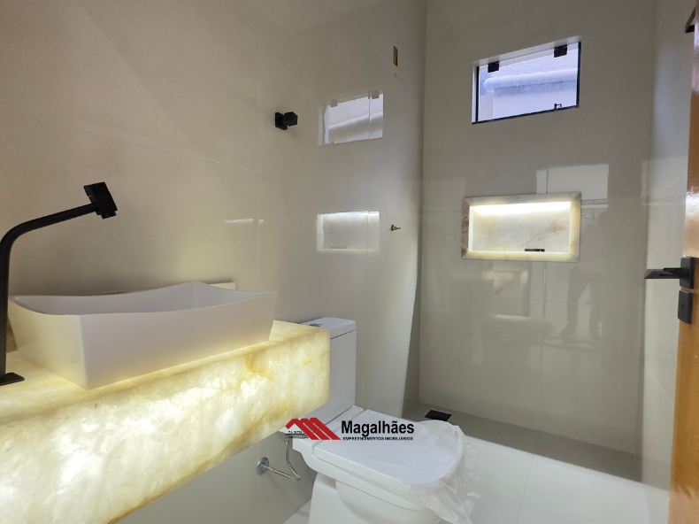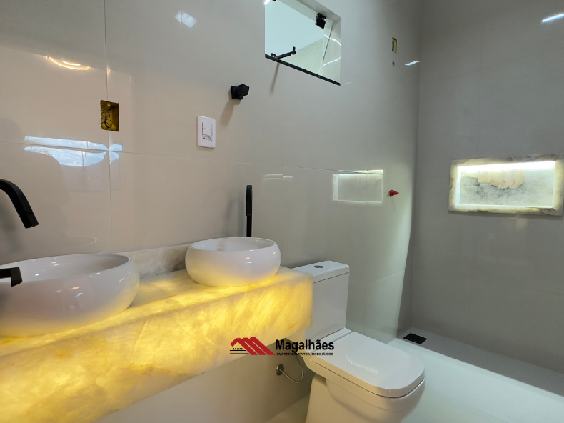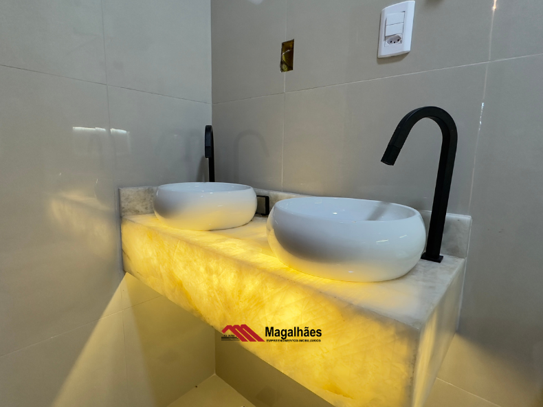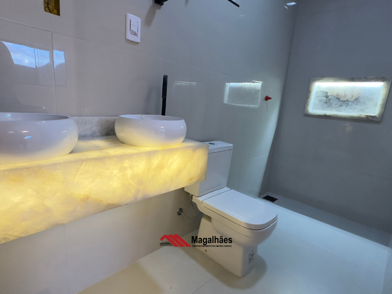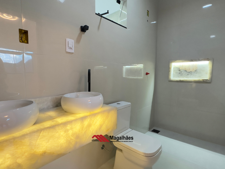 * Banheiros com acabamento premium: balcões em Quartzo Iluminado e nichos esculpidos na mesma pedra