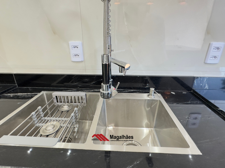 Cozinha gourmet com ilha e balcão em pedra Via-Láctea – charme e exclusividade.